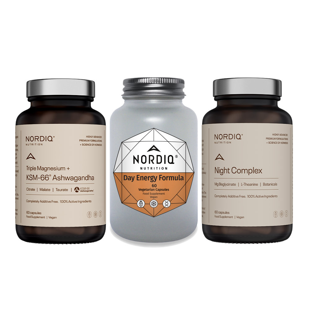 Energija čez dan se začne s kakovostnim spancem. Samo dobro naspani in spočiti smo lahko učinkovito kos dnevnim izzivom. Paket »Spanec in energija« poskrbi za najboljšo večerno umiritev, kakovosten spanec in s tem najboljšo nočno regeneracijo. Za to bosta poskrbela Trojni magnezij + ašvaganda in Night Complex, z adaptogenimi zelišči, magnezijem in L-teaninom. Po kakovostnem spancu pa bo za maksimalno energijo in koncentracijo naslednje jutro poskrbela Day Energy Formula. Za razliko od kave bo poskrbel za stabilno raven energije ves dan ter hkrati tudi izboljšal odziv telesa na psihični in fizični stres z rhodiolo.
